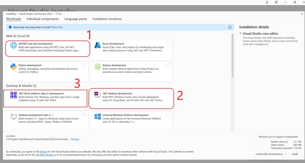 – Tích vào mục 1,2 (Mục 3 là optional để phát triển các ứng dụng cross-platform, có thể cài sau)