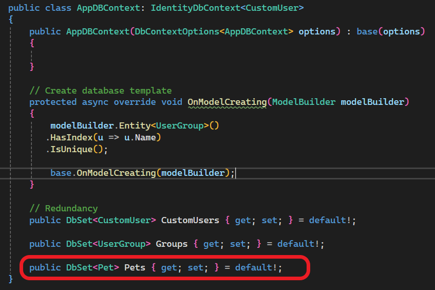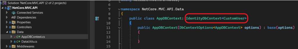 - Tạo file kế thừa từ class DBContext (ở đây IdentityDbContext<CustomUser> cũng kế thừa từ DBContext)
