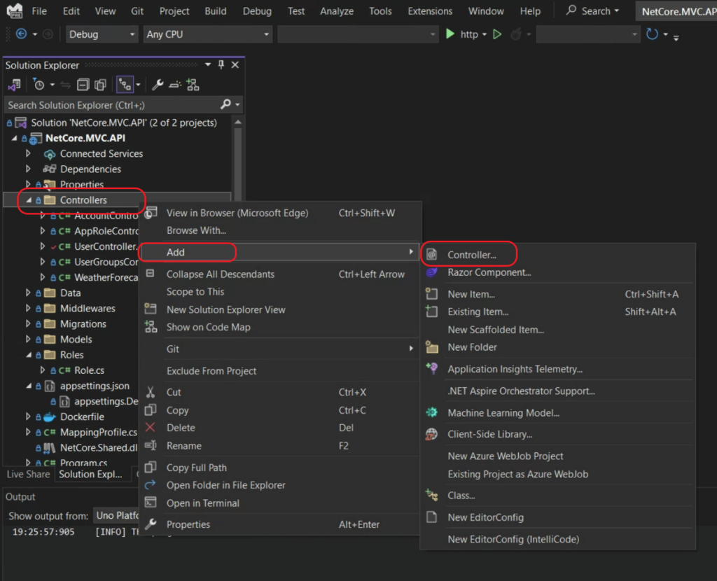Tại thư mục Controllers, chọn Add -> Controller