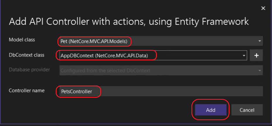 Chọn Model class, DbContext Class, Controller name